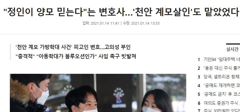 정희원 변호사는 국민 여러분들이 분노를 하는 이유는 공감을 하고 있고 그래도 사실은 밝혀야 하는게 자신들의 입장이라고 이야기를 전했습니다 시민들은 정 변호사의 이야기를 화가 치밀어 올랐는데요 일부 네티즌들은 살인자를 왜 변호를 하는것인 아니면 돈이 그렇게 중요한것인지 자신이라면 절대 변호를 하지 않는다는 등의 의견을 내비쳤습니다